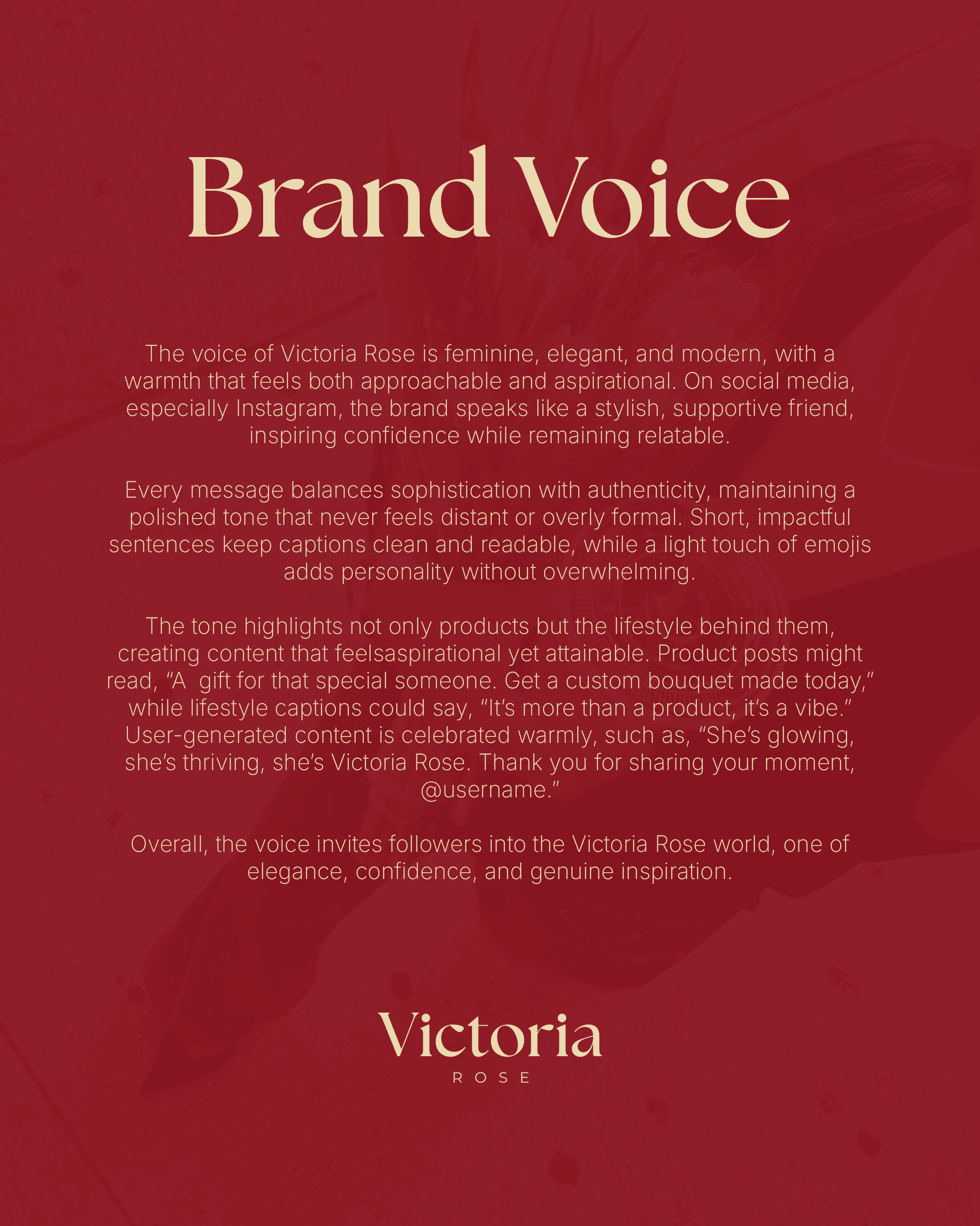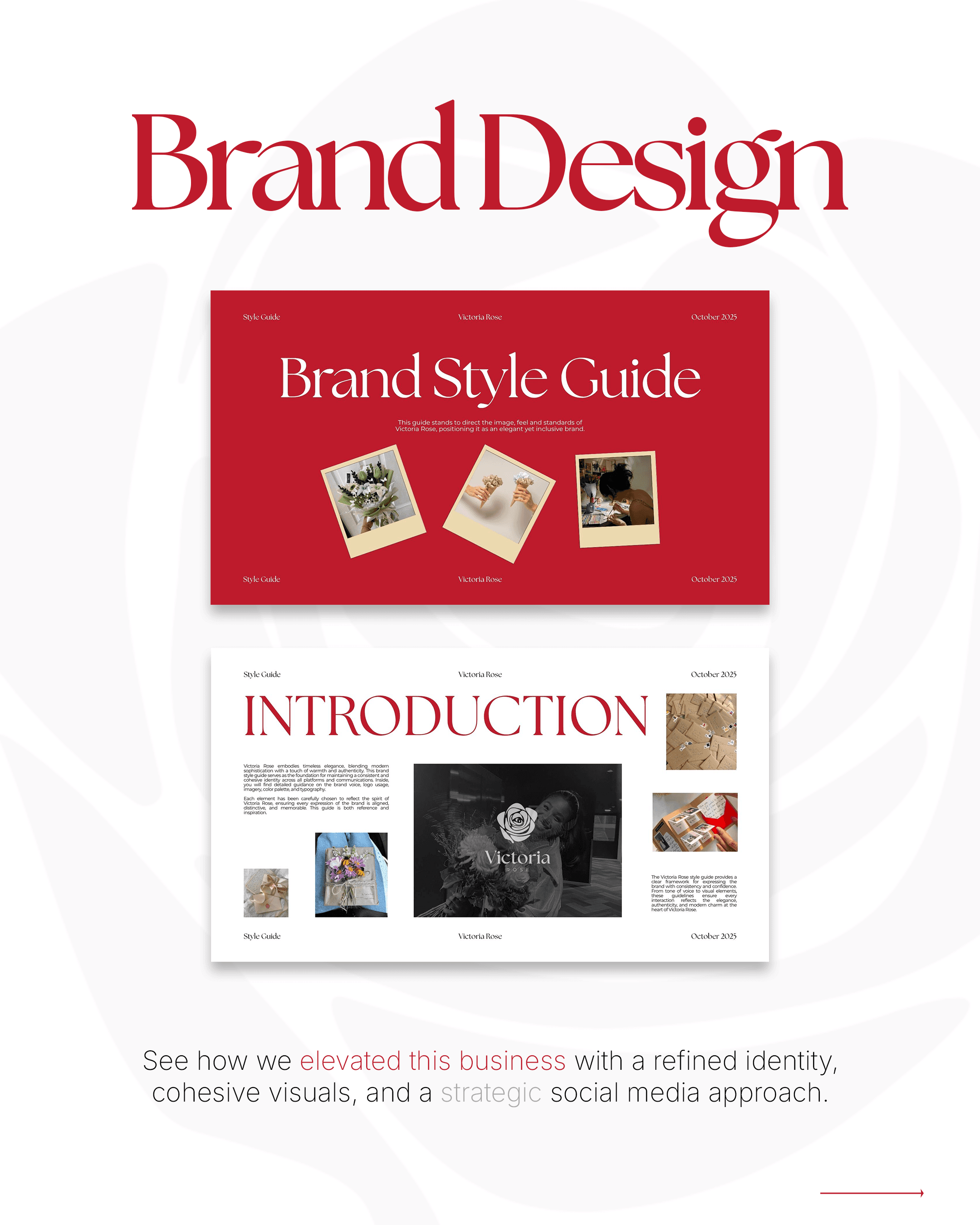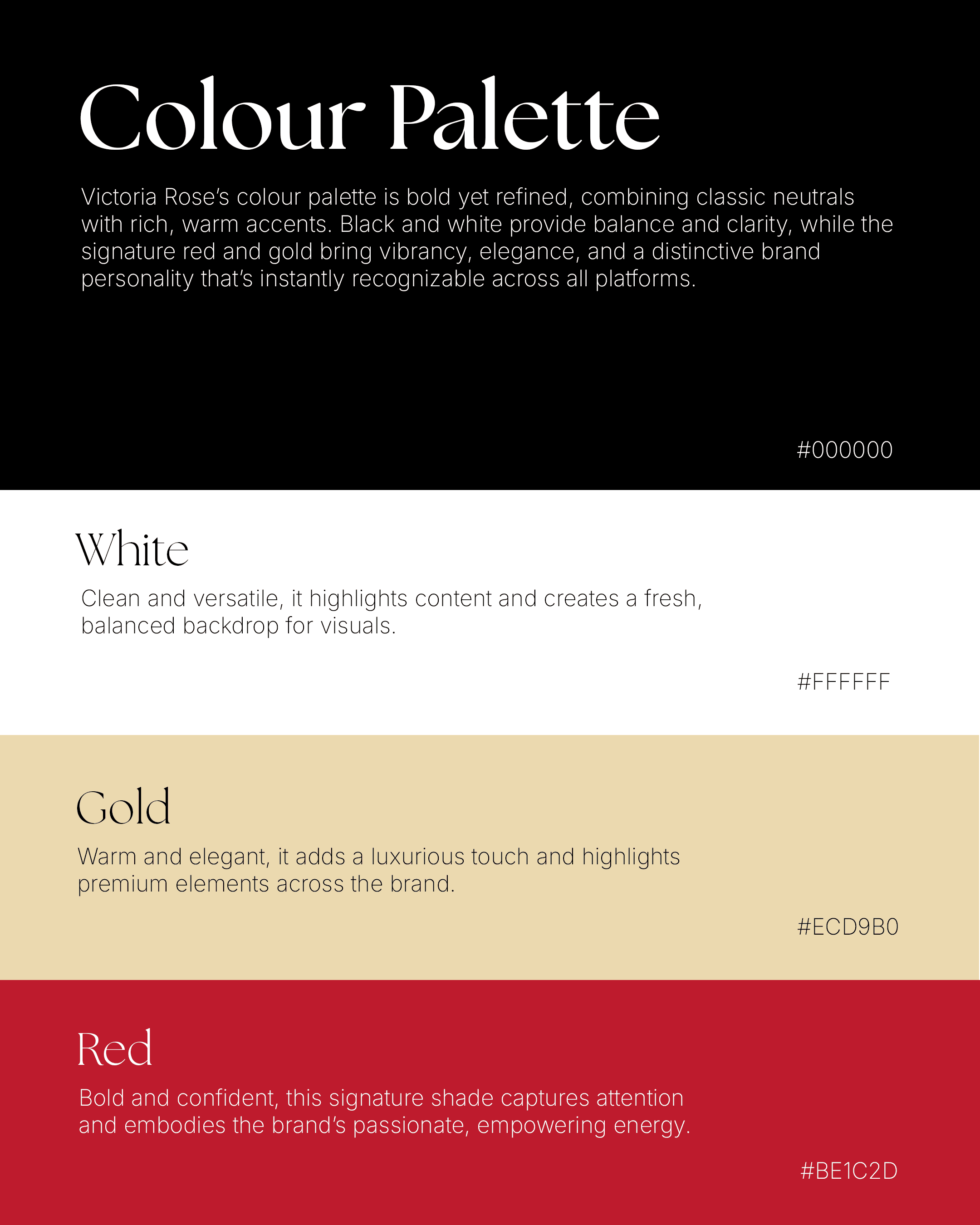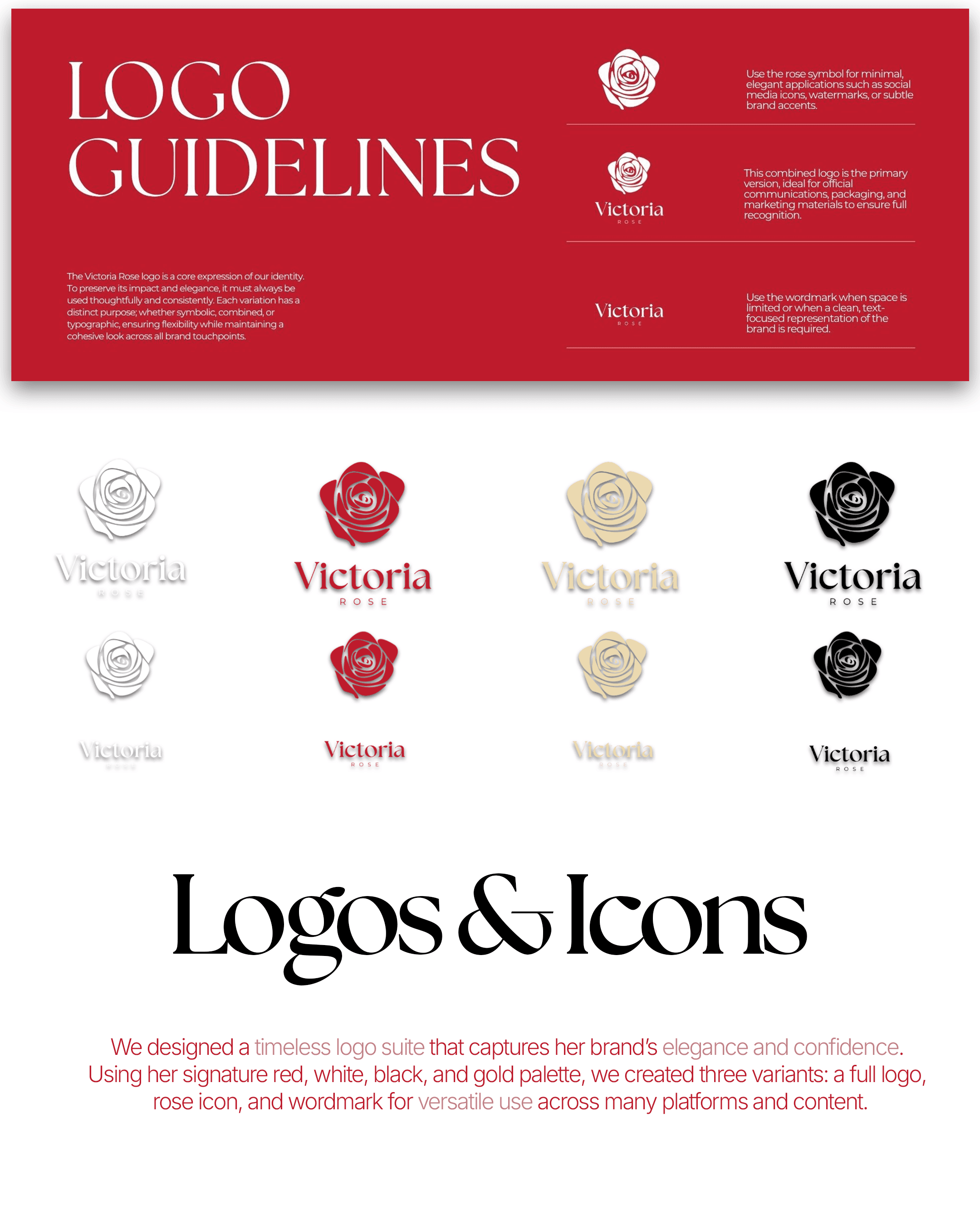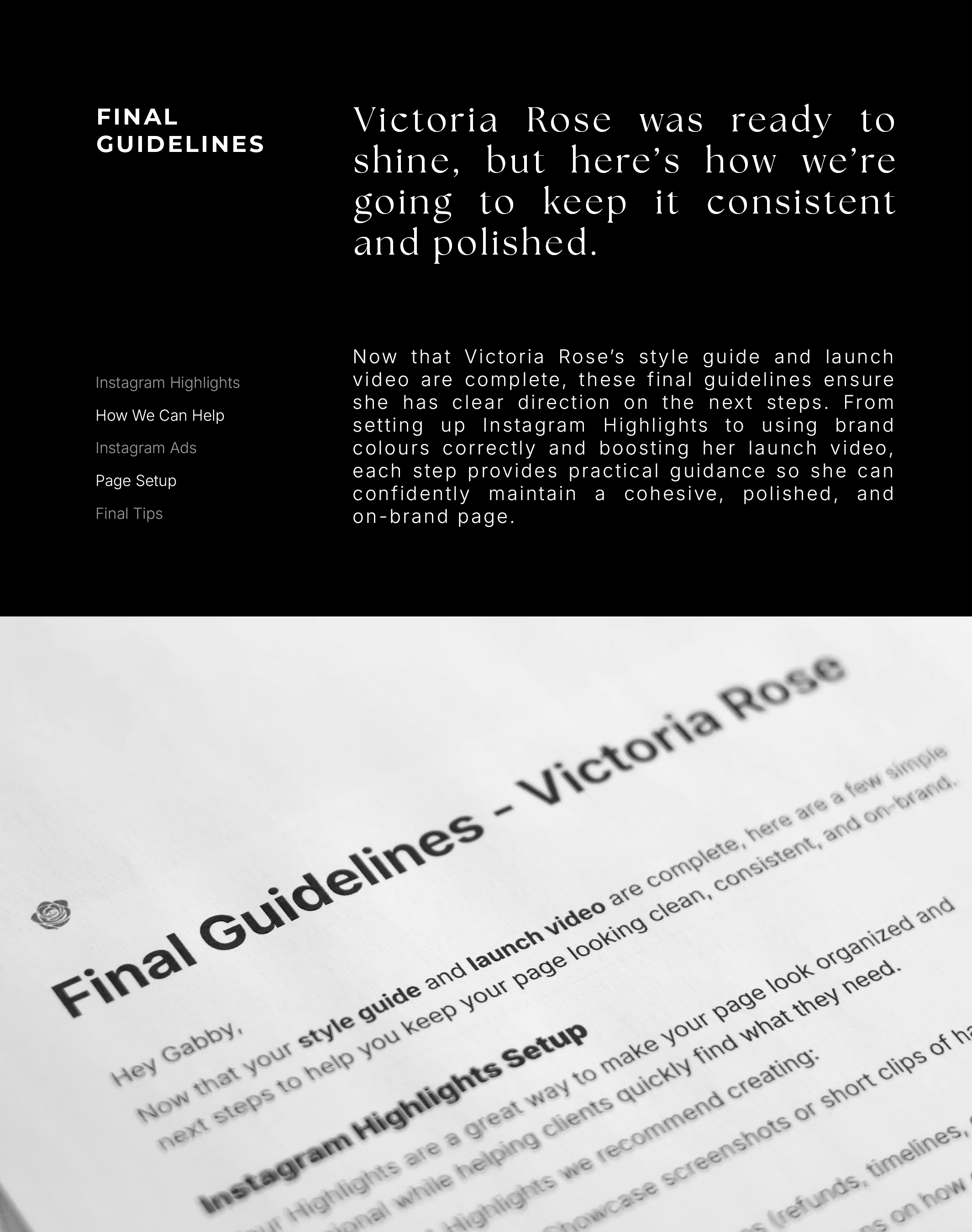 We partnered with Victoria Rose to create a full brand identity from the ground up. This included a colour palette, logo suite, typography, brand voice, social media guidelines, and photo/video guidelines. We also produced a launch video and provided ongoing support to ensure the brand’s visual and verbal identity was consistent across all channels. The result was a cohesive, professional brand ready to engage and grow her audience.